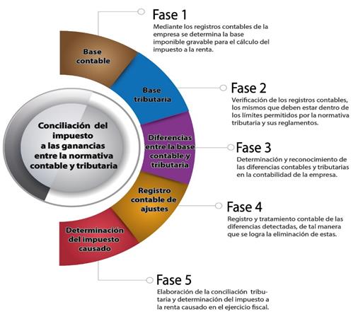La guía propuesta incluye cinco fases para la conciliación tributaria del impuesto a las ganancias, bajo la normativa fiscal y normativa contable.