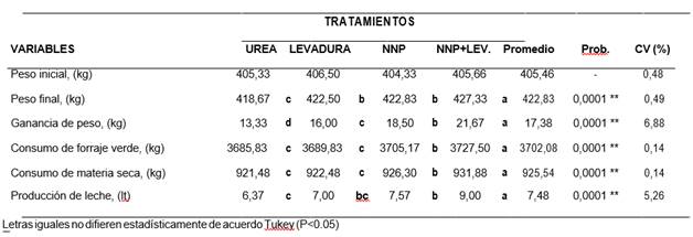 Al finalizar la evaluación de los pesos de las vacas, se evidenciaron diferencias altamente significativas (P<0.01) con Nitrógeno no proteico de liberación controlada más Levadura Saccharomyces cerevisiae, se obtuvo el promedio más alto con 427,33 Kg; el rango promedio se encuentra entre 422,50 y 422,83 Kg, siendo para los tratamientos con Nitrógeno no proteico de liberación controlada y Levadura Saccharomyces cerevisiaerespectivamente, mientras que el menor promedio de peso final registrado en las vacas, se originó al emplear Urea, siendo de 418,67 Kg, como se visualiza en la Tabla 1.