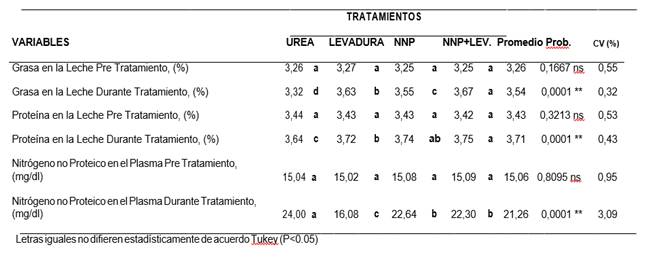 No se registraron diferencias estadísticas (P>0.05) en el contenido de nitrógeno no proteico en el plasma pre tratamientos, registrándose valores de 15,02; 15,04; 15,08 y 15,09 mg/dL para las vacas tratadas con tratamientos Levadura Saccharomyces cerevisiae, Urea, tratamientos Nitrógeno no proteico de liberación controlada y tratamientos Nitrógeno no proteico de liberación controlada más Levadura Saccharomyces cerevisiae respectivamente, mientras que durante el tratamiento, el nitrógeno no proteico en plasma presentó diferencias altamente significativas (P<0.01), con promedios de 16,08; 22,30; 22,64 y 24,00 mg/dL para las vacas tratadas con tratamientos Levadura Saccharomyces cerevisiae, tratamientos Nitrógeno no proteico de liberación controlada más Levadura Saccharomyces cerevisiae, tratamientos Nitrógeno no proteico de liberación controlada y Urea respectivamente. ( Tabla 2).