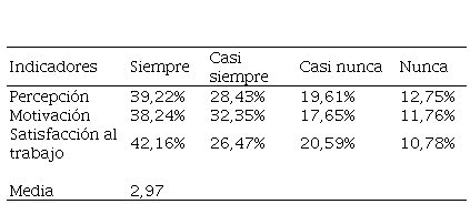 Tales resultados fueron deducidos de las respuestas de los encuestados conformados por docentes de educación media en las instituciones que fueron objeto de estudio, niveles bajo en cuanto a los componentes, percepción, motivación y satisfacción en el trabajo, ya que muestran poca capacidad para asumir experiencias ni conocimiento significativo, para construir actividades que estimulen su quehacer; así como tampoco se muestran siempre dispuestos al cumplimiento de metas personales ni institucionales, mostrando actitudes negativas ante los requerimientos de los miembros de la comunidad educativa.