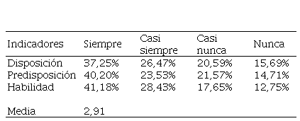 En la Tabla 2 mostrada relativa al análisis de la variable apropiación tecnológica, y sus dimensión componentes conductuales, conformados por disposición, predisposición y habilidad, se observan las frecuencias en las respuestas de los docentes consultados, mostrando una mayor tendencia en la opción siempre, pero con porcentajes relevantes en las demás opciones; en la cual se evidencia que la disposición se ubica en un 37,25%, el indicador Predisposición en un 40,20% y el indicador Habilidad en un 41,18%.