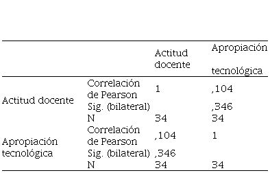Del resultados de la correlación mostrada se infiere que en las instituciones educativas que fueron objeto de estudio, la apropiación tecnológica muestra una baja relación con la actitud d elso docentes en los entornos eduactivos.