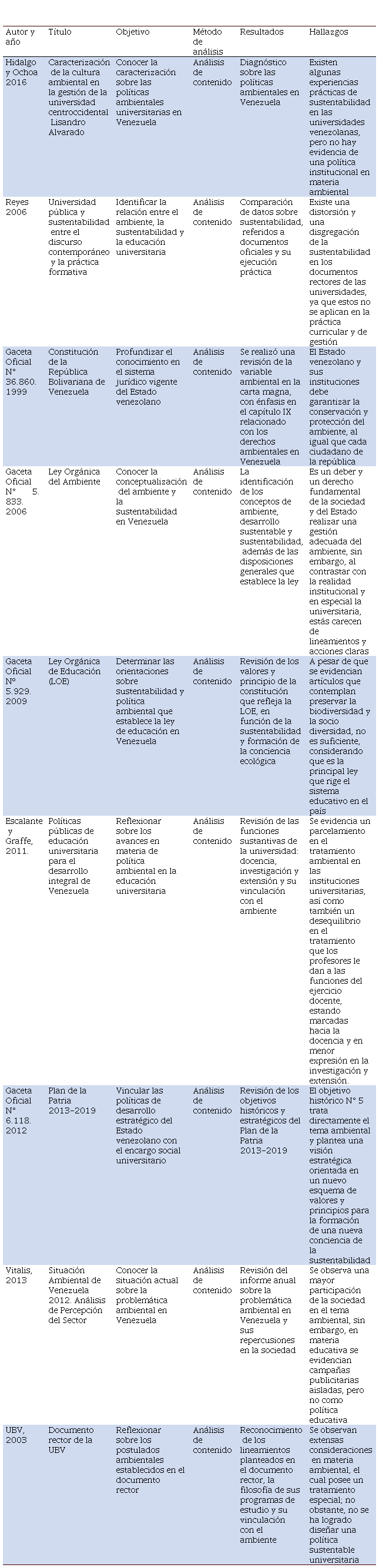 La compilación de material bibliográfico generó una serie de datos referidos a la sustentabilidad y la política ambiental universitaria, cuyo proceso de revisión fue determinante para dar respuesta a la interrogante ¿cuáles son los avances de las políticas de sustentabilidad en el contexto universitario? Por consiguiente, en el cuadro N° 1 se presentan los resultados del estudio, el cual refiere una síntesis de los hallazgos para su posterior interpretación.