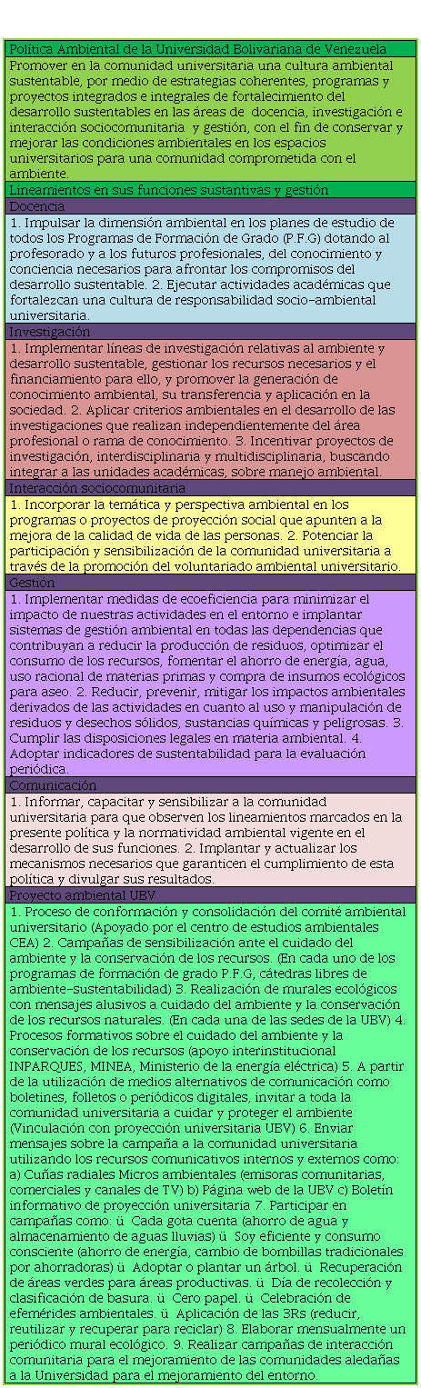 En este sentido, se hace necesario pensar en una propuesta real de establecer una política ambiental o de sustentabilidad universitaria, entendiendo que la Universidad debe estar consciente de la necesidad de incorporar la perspectiva y ética ambiental a toda su actividad y debe asumir esa responsabilidad. Al respecto, cabe señalar la misión de la UBV, establecido en el documento rector 2003
