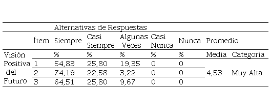 Al analizar los postulados de los autores anteriormente citados, se puede inferir que la visión positiva hacia el futuro significa la expectativa de obtener resultados favorables en la vida de los individuos, mostrando autoestima y generando vías de logro de objetivos más exitosas al tomar mejores decisiones frente a contingencias presentadas.
