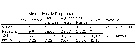 En relación a los autores citados, se entiende la visión negativa hacia el futuro como la expectativa de que sucedan situaciones desfavorables, anticipando que el logro de sus metas se convertirán en un fracaso, reduciendo de esta forma sus esfuerzos para plantearse nuevos objetivos en el futuro.