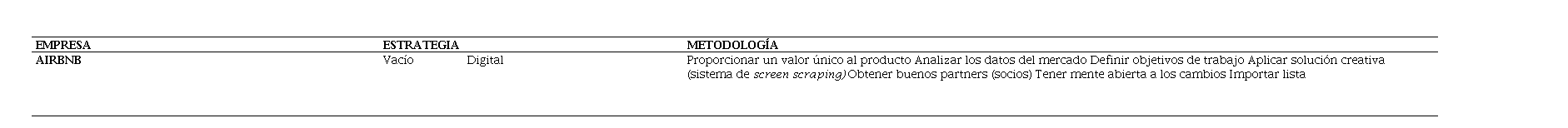 1. AIRBNB. Como empresa que fue fundada en el 2008 por Joe Gebbia, Brian Chesky y Nathan Blecharczyk, es una plataforma digital que vende el concepto de alquilar la habitación de invitados o aquella que no usa el propietario de la casa. Actualmente cuenta con más de 100.000 opciones en línea teniendo presencia en 190 países del mundo, batiendo records de hospedaje de usuarios durante toda su historia (Díaz, s/f). Pero, la pregunta es ¿Cómo consiguió este crecimiento? Basó su estrategia en lo que se denominó como vacío digital. Pues, en 2010 dicha plataforma digital no era lo que actualmente es, e incluso tenía competidores mucho mejores y más posicionados (Ruiz, s/f). A continuación, se describe la estrategia desarrollada por AIRBNB:
