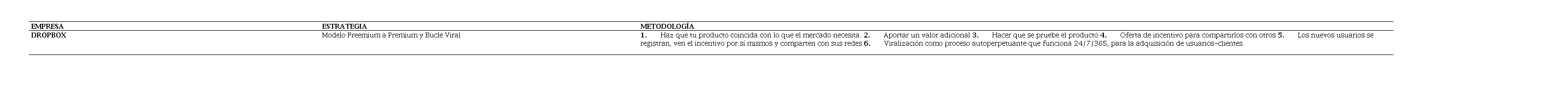 Observación: Dropbox se volvió positivo en el flujo de caja y alcanzó los 500 millones de usuarios registrados en 2016, gracias a su estrategia de Freemium a Premium. La misma consistía en ofrecer a todos los usuarios 2GB de almacenamiento con una cuenta gratuita, con el incentivo de 500 MB adicionales por cada amigo que refieran con éxito, lo que permite a los usuarios obtener hasta 16 GB de forma gratuita.