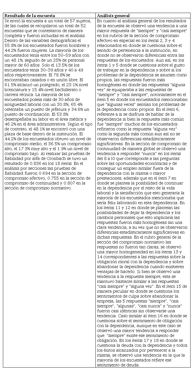 Los resultados generales muestran tendencias a marcadas en las secciones de compromiso afectivo y compromiso de continuidad a mantener dicho compromiso con la dependencia lo cual se traduce en un desempeño mejor estructurado y eficiente en la misma, sin embargo en la sección de compromiso normativo las respuestas fueron más homogéneas con respecto a las obligaciones morales con la dependencia y con los sentimientos de culpa en caso de abandonar dicha dependencia, siendo poco claro la posición de los involucrados de la encuesta en dichas respuestas. A pesar de que en ciertos ítems en la sección afectiva parecen indicar que las personas que cuentan con un desempeño previo en esta institución tienden a generar respuestas de un mayor compromiso, en la evaluación global el compromiso obtenido fue medio, independientemente si la persona evaluada tenía un trabajo previo en la institución o departamento. Estas respuestas nos orientan que en la actualidad los mandos intermedios y altos tienen en general un grado de Compromiso Organizacional medio. Esto influye en como las decisiones a nivel de estos mandos son tomadas impactando de manera directa en la calidad del trabajo y las metas que deben de ser alcanzadas.