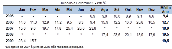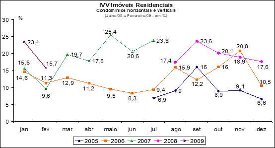 O índice de 23,4%, registrado em janeiro de 2009, foi o maior já verificado neste mês, em todo o período de aplicação da pesquisa do IVV pelo SINDUSCON-MA. Como nos outros anos, houve uma elevação do índice desse mês comparado com o anterior, fortemente influenciado pelas vendas dos imóveis de 2 quartos.