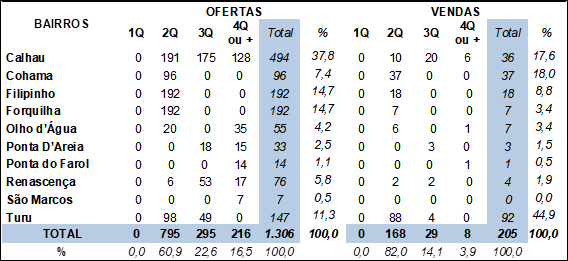 No Filipinho e Forquilha foram vendidos maior número de imóveis de 2 quartos. Este, situado em região periférica e aquele, em situação de declínio, em função da dinâmica da cidade e de razões políticas (Planos Diretores) que sinalizaram seu vetor de expansão para o setor Norte, onde está situada a Ponta d’Areia e o condomínio Farol da Ilha (RONIERD BARROS; PEREIRA FEITOSA; FRANCISCO ROCHA; SINDUSCON-MA, 2013). Essas razões respondem pela maior oferta de imóveis com 2 quartos apenas, com baixo padrão de acabamento e com valor compatível com o poder econômico da classe econômica mais baixa.