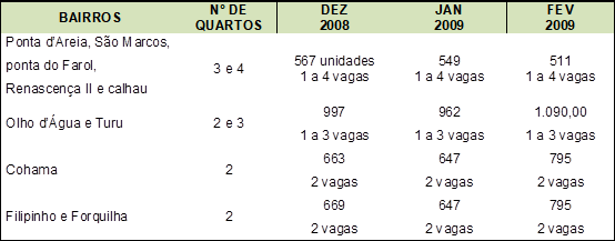 Como produto do boom imobiliário de São Luís, as características dos imóveis ofertados e vendidos em fevereiro de 2009 eram as seguintes: os imóveis de quatro quartos foram mais vendidos no Olho d’Água e na Ponta d’Areia, onde situa-se o condomínio Farol da Ilha e onde o valor do m² era/é mais caro. Isso revela que as famílias que residem nesses bairros têm melhores condições econômicas e essa situação é revelada na preferência pelo local de moradia, bem como na escolha de imóveis maiores e mais confortáveis, visto que há os fatores hedônicos (ligados ao prazer de se morar em determinado lugar), mas também há o fetiche que a mercadoria imobiliária exerce sobre o cliente.