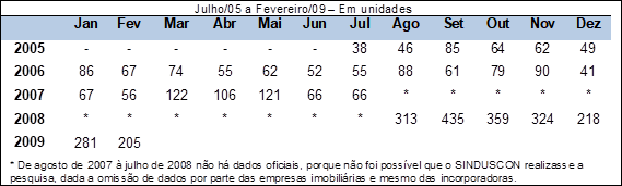 Como nos outros anos, o índice de fevereiro de 2009 recuou em relação à janeiro, registrando 15,7% e os imóveis de 2 quartos permaneceram como os mais vendidos, influenciando na geração do índice. Dos resultados apurados no mês de fevereiro de 2009, destacaram-se os seguintes dados, de acordo com o SINDUSCON-MA (2009): Apesar dos imóveis de 2 quartos terem sido os mais vendidos, com 160 unidades negociadas, houve o crescimento das vendas dos de 3 quartos em relação aos meses anteriores, com 28 unidades vendidas. O bairro que mais contribuiu para as boas vendas dos imóveis de 2 quartos foi o do Turu e, para os de 3 quartos, o do Calhau. Quanto à venda de imóveis na planta, todos de 2 e 3 quartos, respondeu por 45,8% das vendas e os no acabamento, exclusivamente de 2 quartos, representaram 36,6%. (SINDUSCON-MA, 2009).