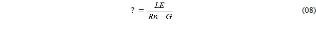 Seguindo o procedimento metodológico sugerido por Basstiaansen et al. (2005), a evapotranspiração horária foi extrapolada para valores diários, considerando constantes os valores da fração evaporativa, e integrados os valores diários do saldo de radiação, conforme a equação: