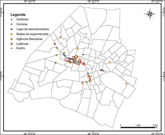 Adentrando as variáveis escolhidas para analisar o centro e a centralidade em Araguaína, elaboramos o mapa 1, no qual aparece a delimitação do centro e a espacialização das variáveis analisadas. Verifica-se que das 12 agências bancárias da cidade, 8 encontram-se no centro, mostrando que sua primazia em termos absolutos se comparado à outras áreas da cidade é significativa. Não obstante, deve-se lembrar de que no centro estão localizadas todas as agências do Banco do Brasil e do Itaú, além de duas do Bradesco (inclusivo o Bradesco Prime), o que confere a essa área da cidade em termos qualitativos importância fulcral no segmento financeiro.