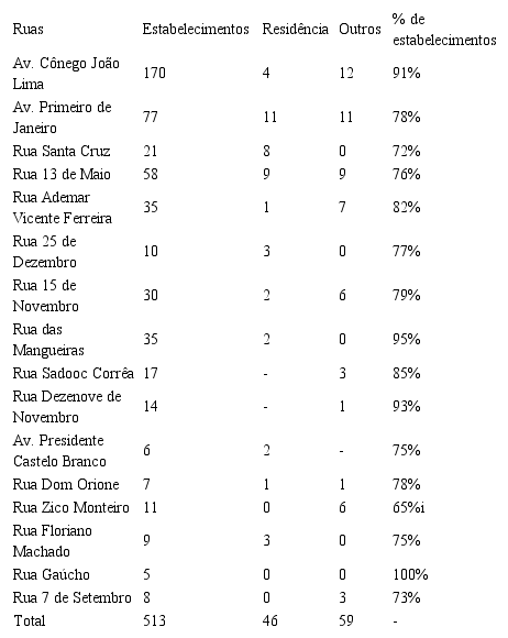 Na tabela 1 encontram-se as ruas (e seus trechos) que foram consideradas como fazendo parte do centro de Araguaína. Nelas foram contabilizados um total de 513 estabelecimentos comerciais e de serviços; 46 residências e 59 classificados como outros, que inclui unidades não identificadas e lotes vazios. As ruas que possuem maior taxa de uso produtivo são as Ruas Gaúcho (100%), Rua das Mangueiras (95%), Rua Dezenove de Novembro (93%) e Avenida Cônego João Lima (91%). Os altos índices que apresentam essas primeiras ruas se devem muito em função dos pequenos trechos selecionados, ao contrário da última, que de fato possui grande densidade econômica em todo seu trajeto.
