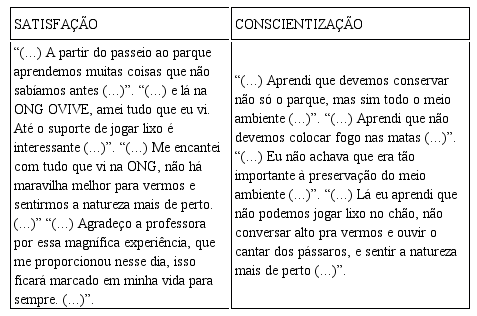 A partir da análise dos relatórios entregues posteriormente às atividades teóricas e de campo, percebeu-se, através dos textos, que mostravam satisfação e conscientização dos alunos. Frases - I.E.; “(...) A partir do passeio ao parque, aprendemos muitas coisas que não sabíamos antes (...)” e “(...) Eu não achava que era tão importante a preservação do meio ambiente (...)” - foram bastante frequentes.