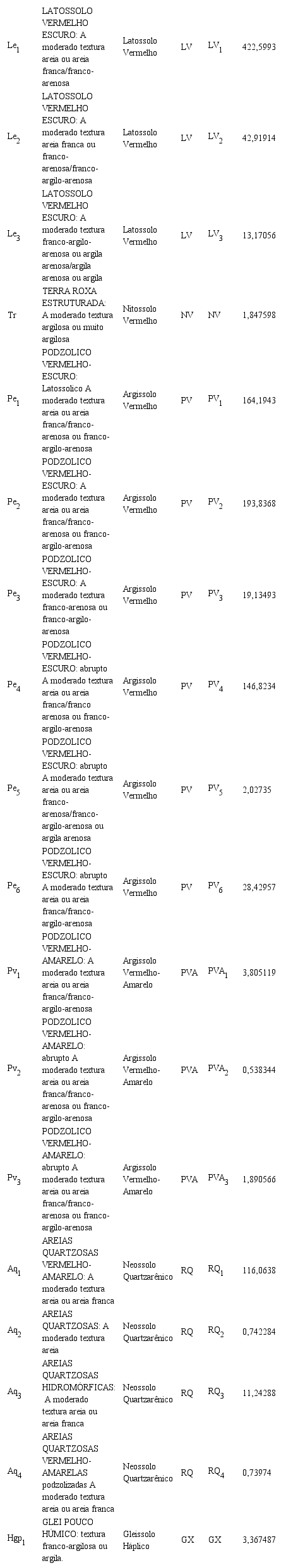 Na área de estudo, os solos predominantes são os Latossolos e os Argissolos, sendo que os Argissolos representam cerca de 560km2, enquanto os Latossolos ocupam cerca de 480km2. Os Neossolos Quartzarêrnicos, por sua vez, ocupam cerca de 130km2; os Gleissolos, 4km2. (Quadro 1)