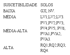 • Suscetibilidade Baixa: dentro desse grupo, estão, principalmente, os topos e as áreas com declividade abaixo de 6% e quanto aos solos há maior ocorrência dos latossolos. Cerca de 10% da área das erosões se encontra nessa unidade. Sendo assim, as erosões dentro dessa classe podem ser entendidas como em processo avançado de evolução (erosão remontante), pois se encontram próximas aos seus divisores topográficos.