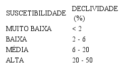 • Suscetibilidade Moderada: esse grupo se localiza nos terços médios das vertentes, principalmente em áreas de Latossolos e Argissolos. Geralmente as declividades encontradas estão acima de 6% e as vertentes são retilíneas. Esse grupo tem a maior concentração de feições erosivas, abrangendo cerca de 54% dessas erosões.