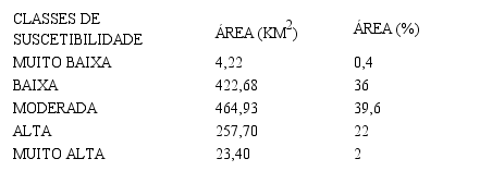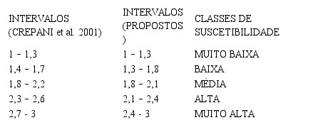 Os resultados foram discretizados em 5 classes (Tabela 1), partindo dos ambientes menos suscetíveis para os mais suscetíveis (CREPANI et al. 2001). Os intervalos foram adaptados dos originais propostos para se adequar as características naturais da área em estudo.