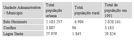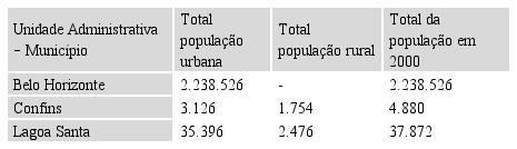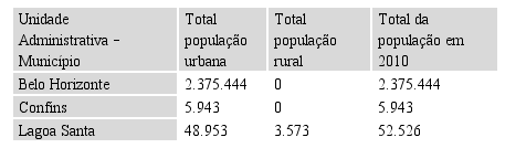 As tabelas 01 a 03 abaixo colacionadas demonstram a evolução demográfica desde o censo de 1991, sendo que 2010 (IBGE), em Lagoa Santa existiam 52.526 habitantes, enquanto em Confins, 5.943 habitantes, sendo todos da zona urbana, em razão da alteração do Plano Diretor datado de 2009 que extinguiu a zona rural daquele município.