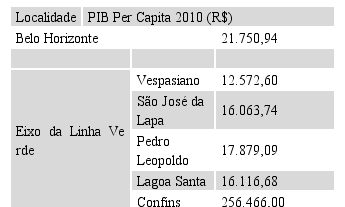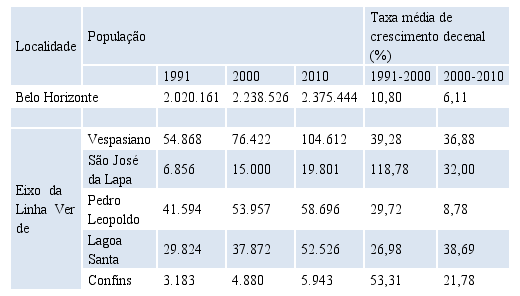 Os municípios integrantes do eixo da Linha Verde também apresentaram expressivas taxas de crescimento demográfico nos períodos 1991-2000 e 2000-2010, excetuando-se Belo Horizonte e Pedro Leopoldo, indicativo da pequena inserção dos mesmos no processo de ocupação da metrópole. Conforme se verifica da tabela abaixo, na última medição (2000/2010), houve um acréscimo populacional em Confins da ordem de 21,78%, o que demonstra um intenso processo de urbanização, alavancado, em tese, pelas diretrizes expansionistas e obras estruturantes dos Governos Estadual e Federal no Eixo Norte da Metropolitana.