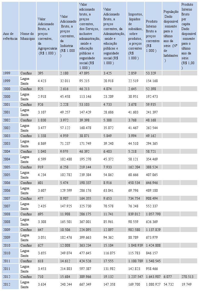 Fonte: Fundação João Pinheiro (FJP), Centro de Estatística e Informações (CEI) – Instituto Brasileiro de Geografia e Estatística (IBGE), Coordenação de Contas Nacionais (CONAC). Elaboração: Fundação João Pinheiro (FJP), Centro de Estatística e Informações (CEI). (www.fjp.mg.gov.br) - < http://www.fjp.mg.gov.br/index.php/noticias-em-destaque/2678-fundacao-joao-pinheiro-divulga-pib-dos-municipios-de-minas-gerais>. Acesso em: 30 maio 2016, 15:20:00.