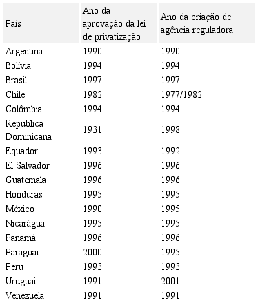 O quadro 1, por exemplo, ilustra esse cenário apresentando o ano da aprovação de leis de privatizações na América Latina, bem como o período referente à criação das respectivas agências reguladoras. Com isso, é preciso ter em mente que o Chile foi inaugurador do processo de liberalização da privatização recente, apoiando o processo de forma bastante rápida e envolvendo diversos setores da economia. Já o Brasil e o Paraguai foram os derradeiros na aprovação de leis de privatização.