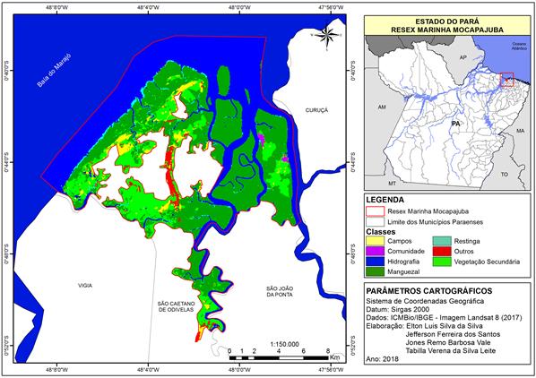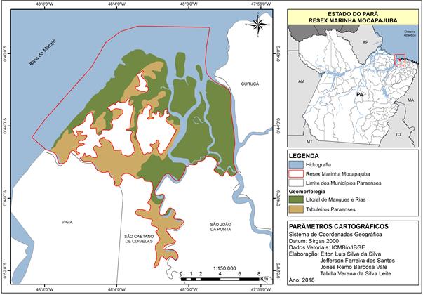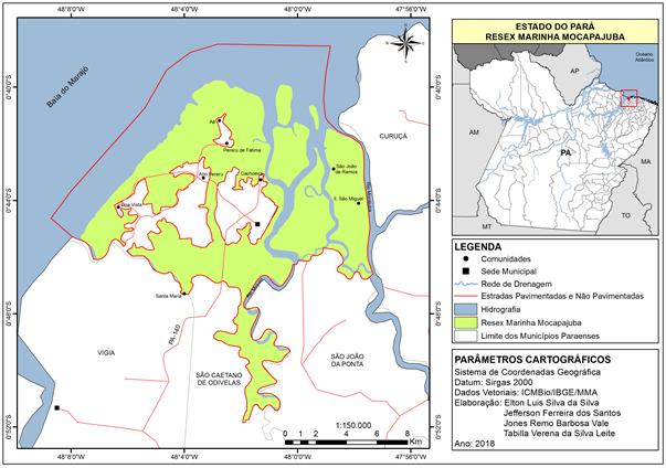A Reserva Extrativista Marinha de Mocapajuba localiza-se no município de São Caetano de Odivelas, zona costeira do nordeste paraense (Figura 1). Limita-se ao norte com o oceano atlântico; a leste com o município de Curuçá; a oeste com o município de Vigia; e ao sul com São João da Ponta. Possui uma área de aproximadamente 21.029 de hectares. Essa unidade é federal, sendo o Instituto Chico Mendes de Conservação da Biodiversidade/ Ministério do Meio Ambiente (ICMBio) o órgão responsável pela gestão.