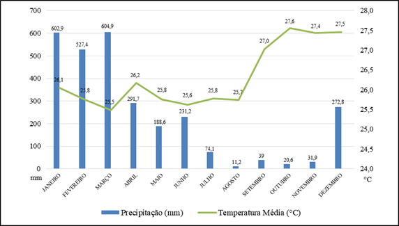 A precipitação na zona costeira da Amazônia Brasileira é determinada pela influência de vários sistemas atmosféricos que variam desde a escala convectiva a escala sinótica: Linhas de Instabilidade (LI); Zona de Convergência Intertropical (ZCIT); Ondas de Leste (OL); Sistemas de Brisas (marítima e terrestre), e em períodos intervalares, a região é afetada pelos fenômenos El Niño e La Niña, causando desta forma, modificação no regime de precipitação da mesma (COHEN et al., 1995). Sendo assim, a pluviosidade não apresenta uma distribuição espacial homogênea, no ano de 2017 houve uma precipitação de 2.896,3 mm. A Figura 2 apresenta os dados de precipitação e temperatura para a área de estudo.