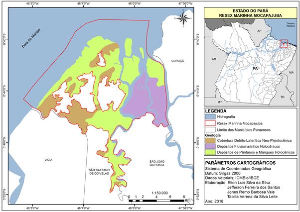 Geologicamente a área de estudo (Figura 3) é marcada pela presença de terrenos muito recentes na escala do tempo geológico, depósitos do Período do Terciário (Formação Barreiras) e Quaternário (Pós-Barreiras), mais precisamente, da Época do Holoceno e do Pleistoceno (ROSSETTI et al., 1989). O Holoceno é caracterizado principalmente pelos depósitos de pântanos e mangues, constituídos por sedimentos predominantemente argilo-siltosos, com muita matéria orgânica, em ambiente flúvio-marinho e/ou litorâneo. O Pleistoceno é caracterizado por uma cobertura detrito-laterítica com sedimentos argilo-arenosos amarelados, gerados por processos alúvio coluviais (ICMBIO, 2014).