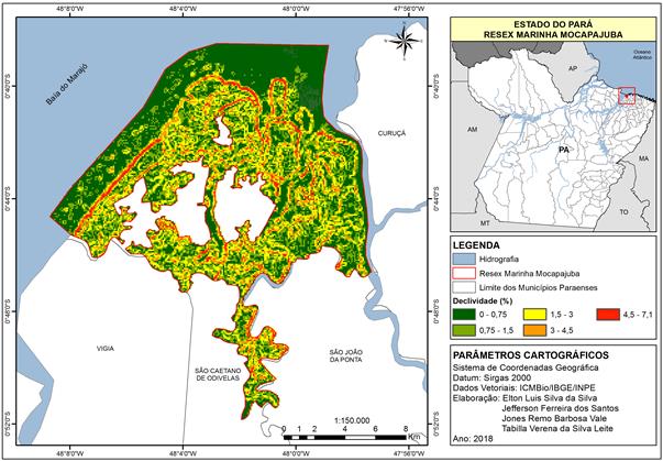 A declividade é considerada como a representação do relevo, isto é, a diferença de altitude entre o ponto mais alto e o mais baixo. Segundo Florenzano (2008), a declividade pode ser expressa em graus ou em porcentagem. A Figura 5 apresenta o mapa de declividade com base nos intervalos sugeridos pela Embrapa (1979), deste modo, classifica-se que a Resex tem relevo plano (0-3%) e suave ondulado (3-8%).