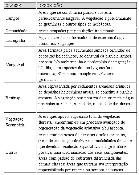 Nos ambientes de transição entre os terrenos de marinha e a terra firme encontram-se áreas de fragmentos de vegetação natural, com presença de vegetação secundária, principalmente, as capoeiras. Essas áreas são resultados do processo de ocupação das comunidades, abertura de áreas para cultivos agrícolas de subsistência e pastagem. Quando a capoeira já está em um estágio avançado, recebe o nome de capoeirão, segundo Teles e Pimentel (2015) esse tipo de vegetação torna-se muito importante para a população local, pois abriga animais de pequeno porte e fornece madeira para uso antrópico. A Figura 7 apresenta os dados do mapeamento do uso e cobertura da Terra da área de estudo.