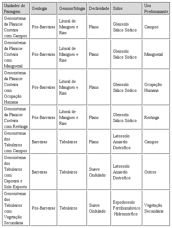 A área de planície corresponde a uma faixa de terra de largura viável que se estende do limite continental dos depósitos quaternários costeiros, normalmente marcados por uma variação topográfica, até a linha de maré baixa, dentre seus ambientes constituintes destacam-se as planícies de maré, manguezais e praia. Os Tabuleiros são constituídos por pequenos platôs, limitadas por pequenas escarpas com alto grau de aplainamento por intemperismo, formadas pelo grupo Barreira.