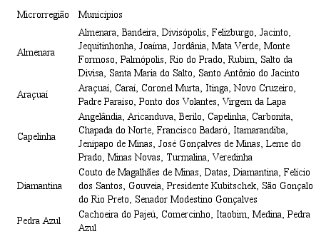 A mesorregião Jequitinhonha é composta por 51 Municípios, os quais se situam ao longo do Rio Jequitinhonha. Conforme a regionalização do IBGE, estes são subdivididos em cinco microrregiões, a saber: (1) Almenara; (2) Araçuaí; (3) Capelinha; (4) Diamantina; e (5) Pedra Azul. A Figura 2 apresenta as microrregiões da mesorregião Jequitinhonha.
