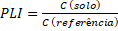 No presente estudo, o grau de poluição do solo para cada metal foi medido pelo índice de carga de poluição (pollution load index - PLI), dependendo das concentrações de metal do solo. A seguir, a Equação 1 foi utilizada para avaliar o nível de PLI nos solos conforme Liu et al. (2005):