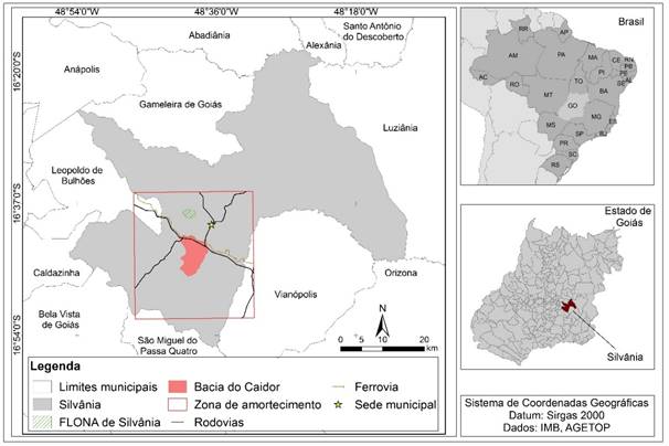 A bacia hidrográfica do córrego Caidor está localizada na porção sul do município e ao sul da malha urbana. Este tem suas cabeceiras posicionadas ao norte e entalha-se em direção ao sul, onde bifurca-se o córrego Variado, o qual, em cerca de 5 quilômetros ao sul, tem seu exultório desaguando no rio dos Bois (Figura 1). Ao norte, a bacia do córrego Caidor limita-se com seu divisor de águas, a bacia do ribeirão Vermelho, onde estão a FLONA e área urbana de Silvânia.