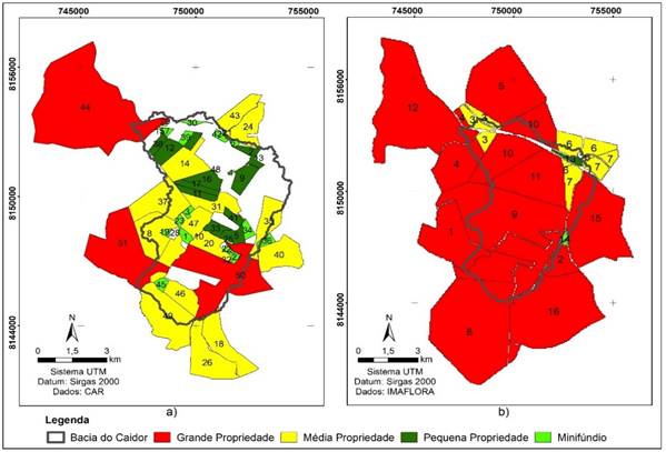 De acordo com os dados do CAR, existem 51 propriedades inseridas na bacia do córrego Caidor, sendo majoritariamente de médias propriedades, entre 4 e 15 módulos fiscais (Figura 2a). Segundo o IMAFLORA, existem 16 propriedades inseridas na bacia do córrego Caidor, sendo majoritariamente de grandes propriedades, com mais de 15 módulos fiscais (Figura 2b). Essa diferença no número de propriedades, entre as duas bases apresentadas, se deve ao fato de a base de dados do CAR ser alimentada por autodeclaração, enquanto a base de dados do IMAFLORA é alimentada por dados georreferenciados do INCRA. Destaca-se que um módulo fiscal em Silvânia é equivalente a 30 hectares.