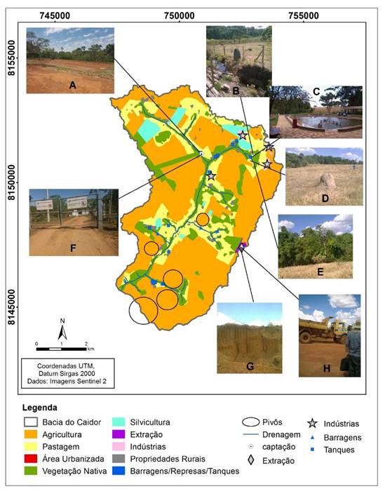 Para validação do mapa de uso e cobertura da terra, foram feitas 3 visitas de campo à área de estudo, nos dias 31 de agosto, 19 de outubro e 16 de novembro de 2017. Nessas visitas, realizaram-se registros fotográficos e coletas de pontos de GPS em áreas representativas das classes mapeadas. Durante as visitas, constatou-se a predominância de atividades agropecuárias e a presença de indústrias, barragens, tanques para criação de peixes (próximos ao canal fluvial), além de mineração referente à extração de cascalho laterítico próximas aos divisores de água (topos).