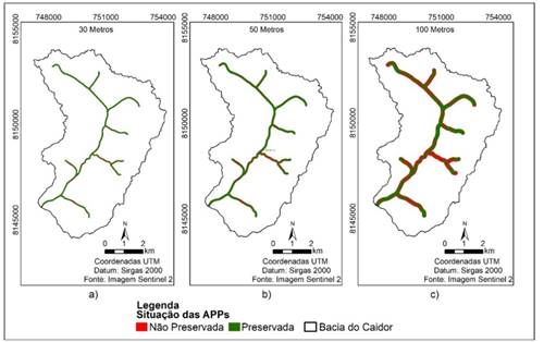 A distribuição espacial das áreas não preservadas não está concentrada em pontos específicos e podem ser observadas nos três cenários ao longo de todo o curso fluvial, da cabeceira ao exultório, como demonstram os mapas da Figura 5.