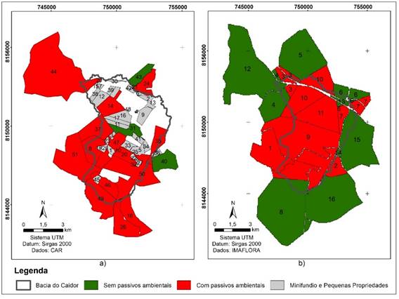 Segundo o novo Código Florestal, as pequenas propriedades (entre 1 e 4 módulos fiscais) e minifúndios (menor que 1 módulo fiscal) não são obrigados a ter reserva legal (BRASIL, 2012). Nessa pesquisa, a menção aos passivos ambientais em pequenas propriedades e minifúndios refere-se apenas à falta de APPs ao longo dos cursos hidrográficos. Esta análise de passivos ambientais foi gerada com dados do CAR e IMAFLORA (Figura 6), onde a ausência de passivos está destacada na cor verde, enquanto a sua presença está destacada na cor vermelha.