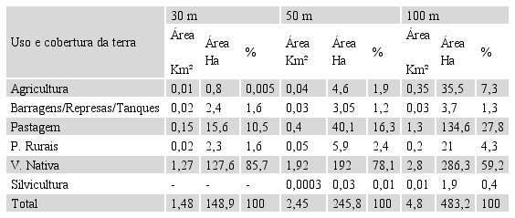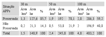 Os mapas da Figura 5 apontam que em todos os cenários de delimitação das APPs existe algum grau de comprometimento da cobertura de dossel referente à vegetação nativa. Quando foram consideradas as tradicionais faixas de 30 metros de distância do canal fluvial, constatou-se que ~14% não estavam preservadas (Tabela 3). No cenário de 50 metros, verificou-se que ~22% da vegetação nativa estava suprimida (Tabela 3). Para o cenário de APPs com 100 metros, este percentual de supressão da vegetação nativa aumentou para ~40% (Tabela 3).