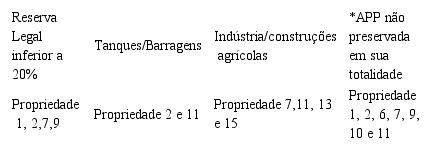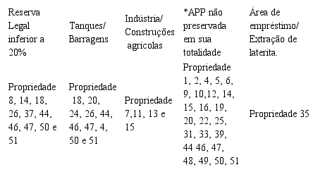 O mapa da Figura 6b indica, segundo dados do IMAFLORA, que 8 das 16 propriedades cartografadas possuem de 1 a 3 critérios para passivos ambientais. A Tabela 6 demonstra que 4 propriedades estão com reserva legal inferior a 20%; 2 propriedades possuem tanques e barragens no canal fluvial; 4 contam com indústrias e construções agrícolas, sendo sete propriedades com problemas de preservação das APPs, ou seja, pouco mais de 50% das propriedades dessa base de dados estão associadas à supressão da vegetação nativa em área de APP. Das quatro classes de passivos ambientais listadas na Tabela 5 e 6, algumas propriedades acumulam até 3 delas.