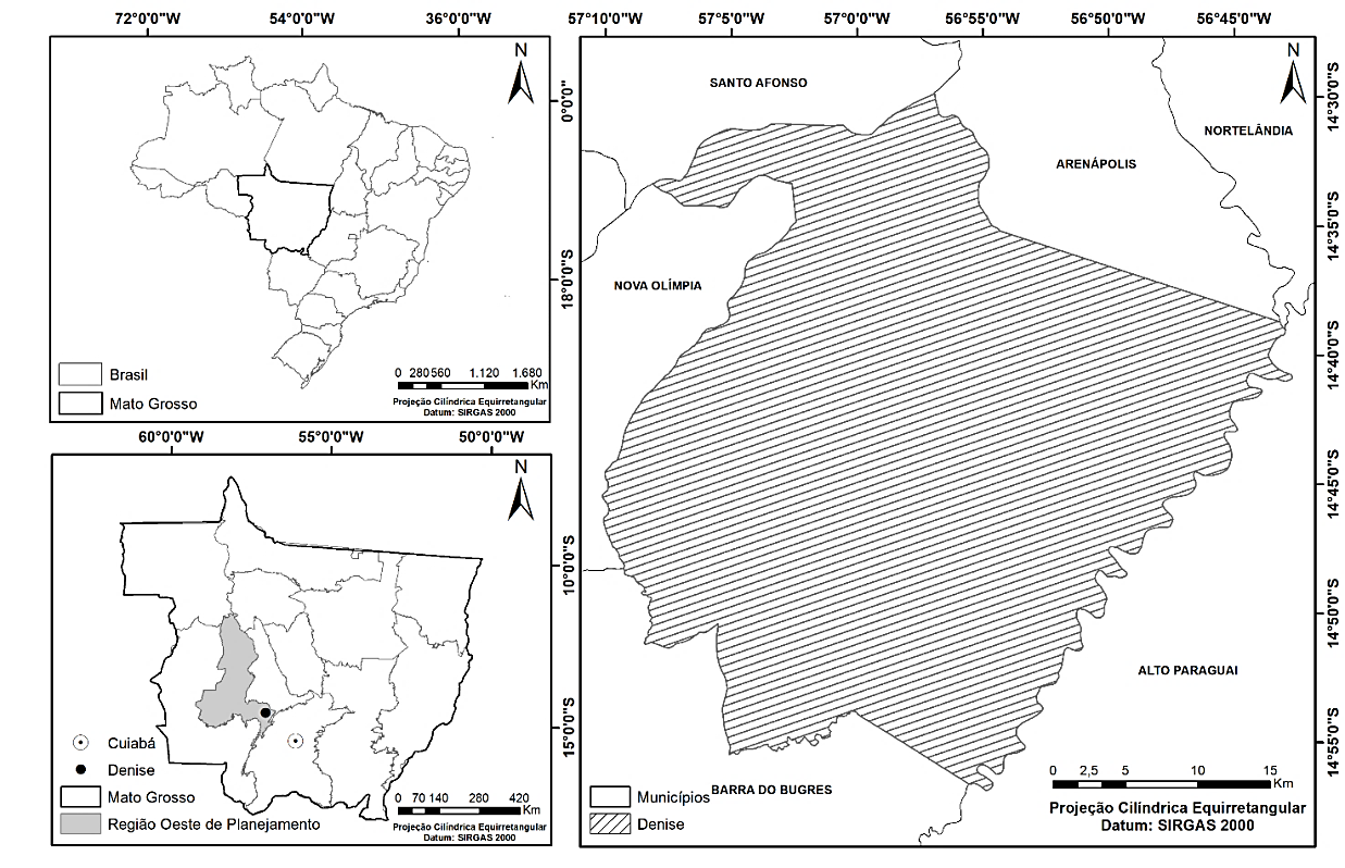 O município de Denise compreende uma área territorial de 1.306,14 km² (IBGE, 2018), estando localizado na região Oeste de Planejamento do Estado de Mato Grosso (Figura 1)(MATO GROSSO, 2017a). A população municipal é de 8.523 habitantes (IBGE, 2010), com um Índice de Desenvolvimento Humano (IDH) de 0,683, abaixo do IDH de Mato Grosso e do Brasil, que é de 0,725 e 0,730, respectivamente (PNUD, 2013). A economia é predominantemente baseada na atividade agropecuária. Em especial a pecuária extensiva, com grandes áreas de pastagem, e o cultivo da cana-de-açúcar (ESQUERDO et al., 2018).