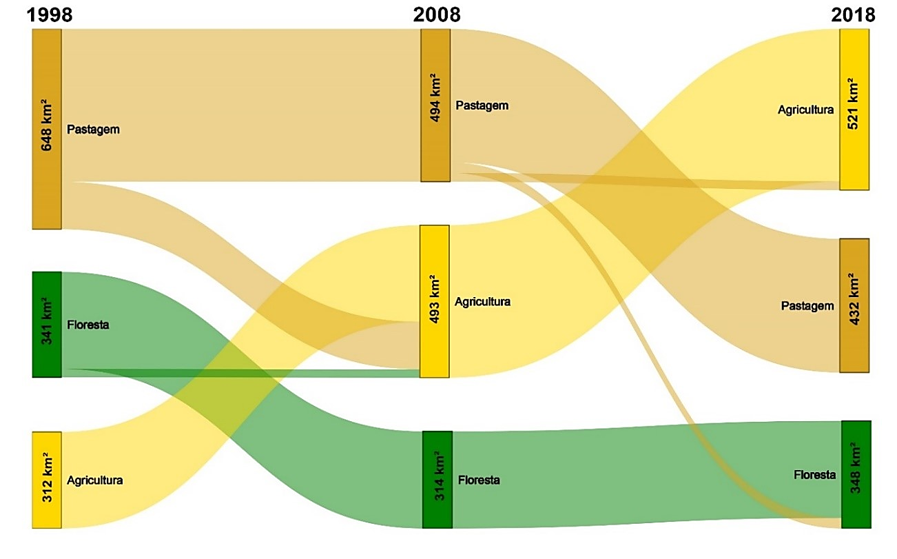 Analisando o Diagrama de Sankey fica clara a dinâmica da cobertura vegetal e usos da terra ao passar dos anos (Figura 3). No período entre 1998 e 2008 pode ser observada a ascensão da área de agricultura, provinda sobretudo de pastagem, representada pela grande linha de fluxo de área, e também, de forma mais branda, pela vegetação natural florestal. Como também entre 2008 e 2018, onde a única classe que cedeu área foi a pastagem, contribuindo para o acréscimo em agricultura e vegetação natural florestal, assim como observado por Esquerdo et al. (2018).