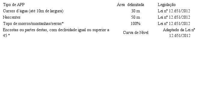 Com base na classificação de Uso e Cobertura Vegetal das Terras do município no ano de 2018, verificou-se situação de conformidade das Áreas de Preservação Permanentes (APPs), conforme a Lei Federal nº 12.651/2012, que institui os parâmetros para a delimitação (Tabela 1).