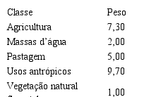 Peso: valores atribuídos aos diferentes tipos de uso e cobertura relativo ao grau de alterações antrópicas.