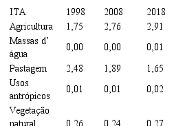 Frente as alterações ocorridas nas duas décadas analisadas os dados do ITA variaram (Tabela 4), porém, se mantendo na faixa entre 2,5 e 5,0 que é definida como regular.