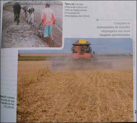 A própria desproporcionalidade nas imagens já sugere uma hierarquização nos formatos de produção e informa status de inferioridade e superioridade. Na imagem relacionada ao pequeno agricultor, localizado no interior nordestino, a técnica adotada para o trabalho na terra é o tradicional arado de tração animal. Essas evidências nos levam a deduzir que há uma explícita desqualificação da unidade agrícola camponesa, considerando que a produção familiar é a responsável direta por boa parte dos alimentos que estão na mesa do povo brasileiro. Sendo assim, os estudantes podem ser levados a pensar que o camponês representa o “atraso”, o antigo, e que precisa “sair de cena” para dar espaço ao moderno, neste caso, ao agronegócio. Nesse sentido, independente da proposta didática do livro, a imagem por si releva a inferioridade e a desvalorização do trabalho familiar, ao tempo em que enaltece o trabalho com tecnologia do agronegócio, contudo, não há problematizações referentes às relações de trabalho e de expropriação socioterritorial e impactos ambientais que o agronegócio promove no campo.